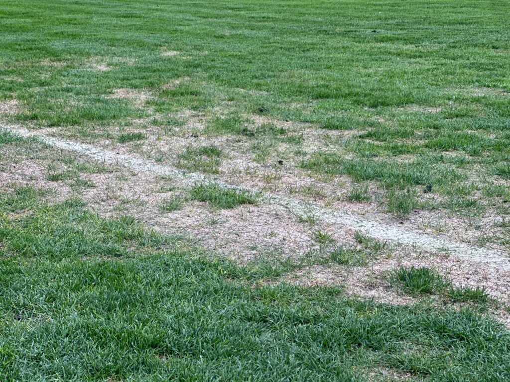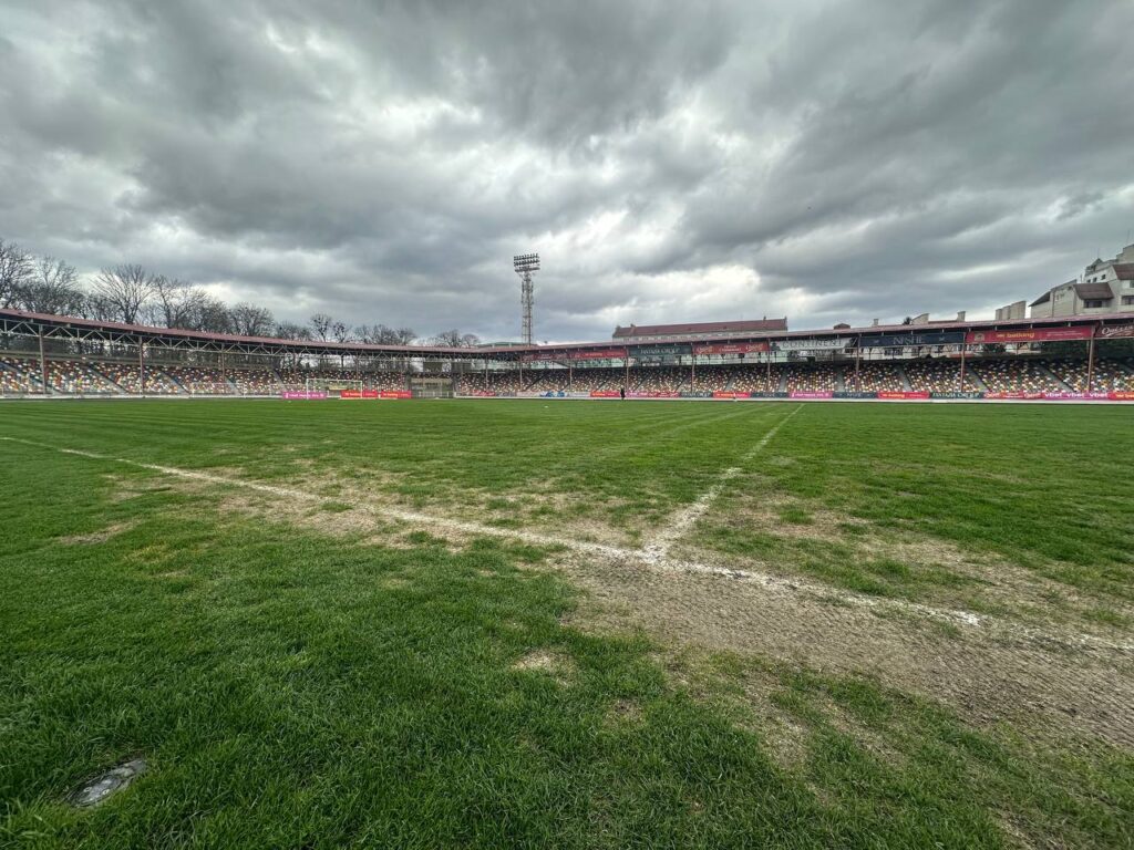 Комісія зафіксувала: газон стадіону у незадовільному стані. Витоптані та оголені ділянки, бур’яни, ущільнений ґрунт, відсутність будь-якого догляду. Біля воріт – болото. На момент передачі в оренду газон був у задовільному стані – це зафіксовано документально.