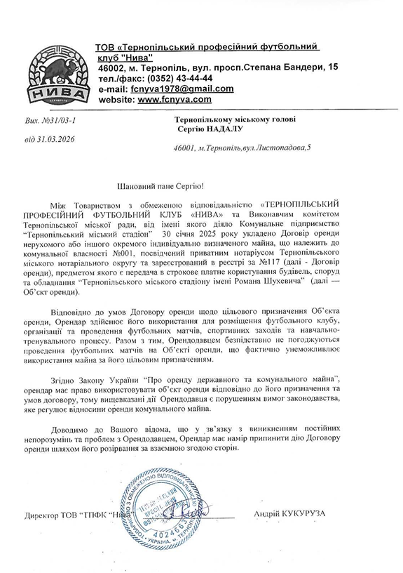 31 березня 2026 року клуб надсилає офіційний лист міському голові: «Орендар має намір припинити дію Договору оренди шляхом його розірвання за взаємною згодою сторін». Підпис, печатка, вихідний номер.Інвестори стверджують, що міська влада безпідставно не погоджуються проведення футбольних матчів. Але факти вперта річ – підстави є три – відсутність договорів щодо укриттів (і це в той час, коли Тернопіль під час обстрілу 19 листопада 2025 року втратив більше 40 невинних життів), незадовільний стан газону (висновок комісії з фахівцем), проведення попереднього матчу без дозволу. Лист «інвесторів» ігнорує всі три.