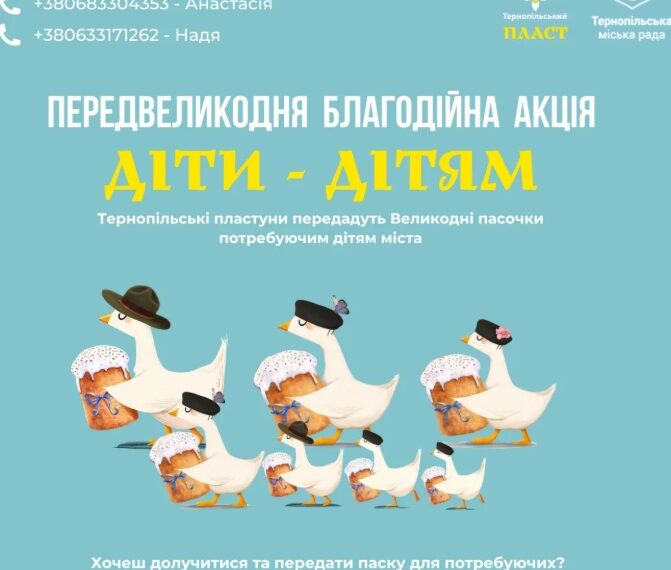 Тернопільські пластуни сьомий рік поспіль запрошують жителів міста долучитися до передвеликодньої благодійної акції “Діти – дітям”. До 9 квітня включно можна принести паску для дітей із малозабезпечених родин.