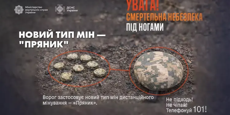 МВС попереджає про новий тип мін “ПРЯНИК”, які ворог розкидає дистанційно по всій Україні. Ці вибухівки майже непомітні та можуть маскуватися під звичайні предмети.