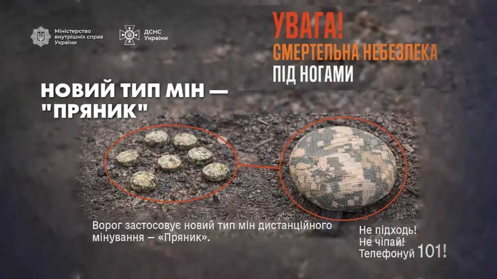 МВС попереджає про новий тип мін “ПРЯНИК”, які ворог розкидає дистанційно по всій Україні. Ці вибухівки майже непомітні та можуть маскуватися під звичайні предмети.