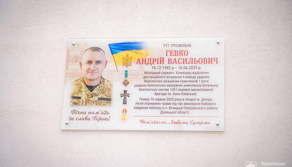 У Тернополі відкрили меморіальну дошку на честь загиблого захисника Андрія Гевка на вулиці Тернопільська, 8Г. 42-річний молодший сержант загинув від поранень, отриманих під час виконання бойового завдання на Донеччині.