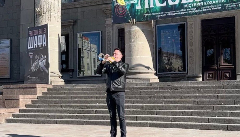 Музиканти виходять до театру за будь-якої погоди та без вихідних. Для них це найменше, що можна зробити, щоб віддати шану загиблим захисникам України. Звуки труби лунають точно під час загальнонаціональної хвилини мовчання.