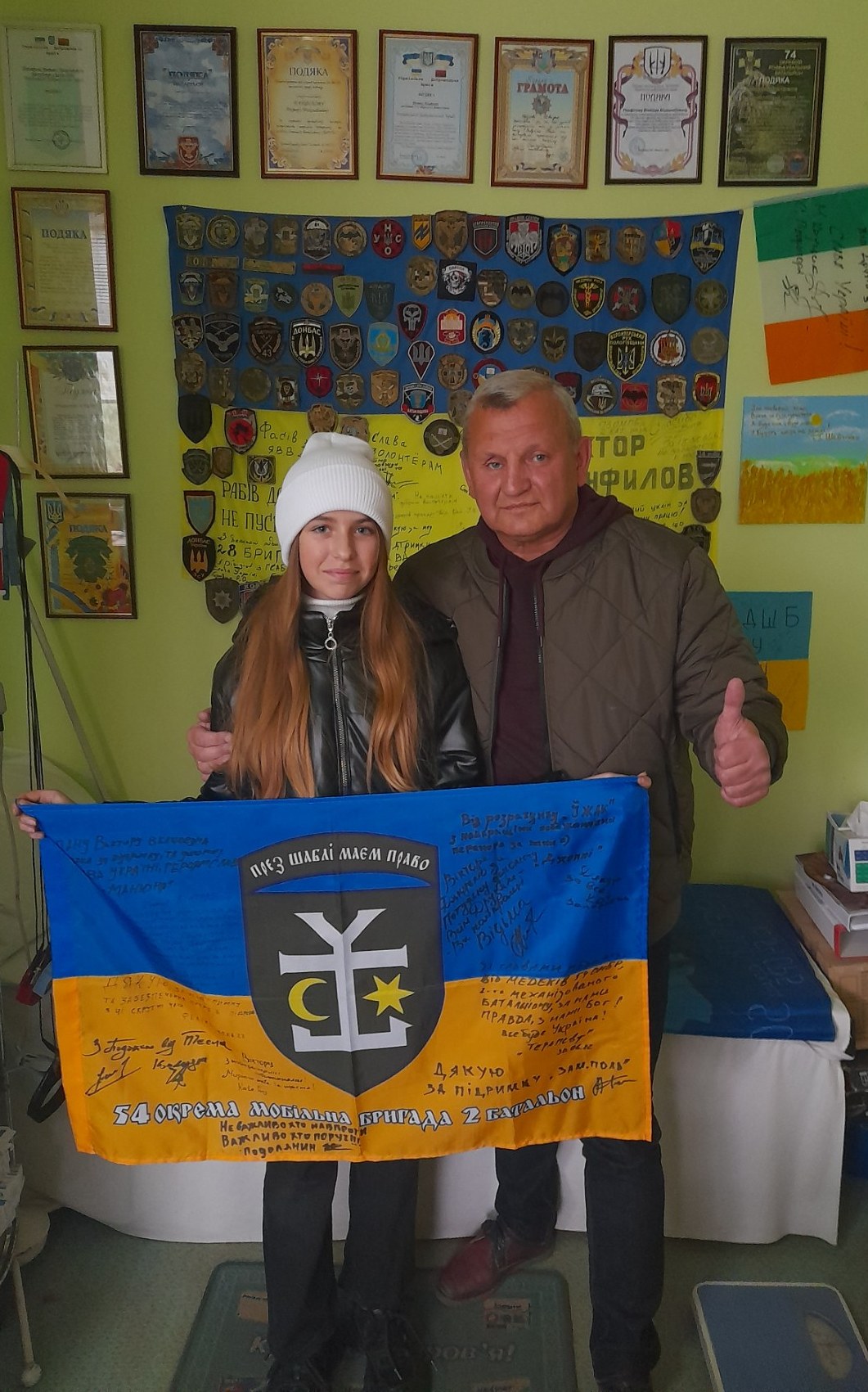 Дівчині подякували за небайдужість і допомогу та подарували прапор з підписами бійців 54 бригади.