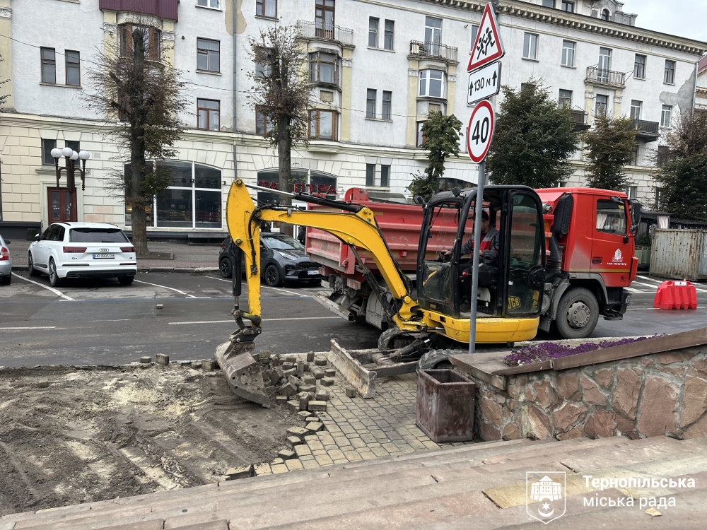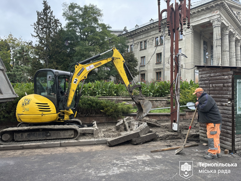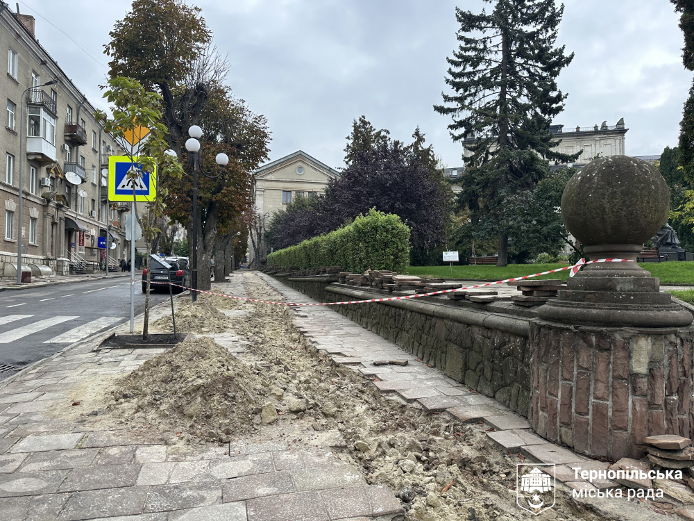 Наразі на об’єкті тривають активні роботи з демонтажу старого покриття тротуару на двох ключових ділянках. Перша черга охоплює територію від Театрального майдану до початку вулиці Юліуша Словацького, а друга — від зупинки громадського транспорту «вул. С. Крушельницької» до входу в будівлю Тернопільської ОВА.