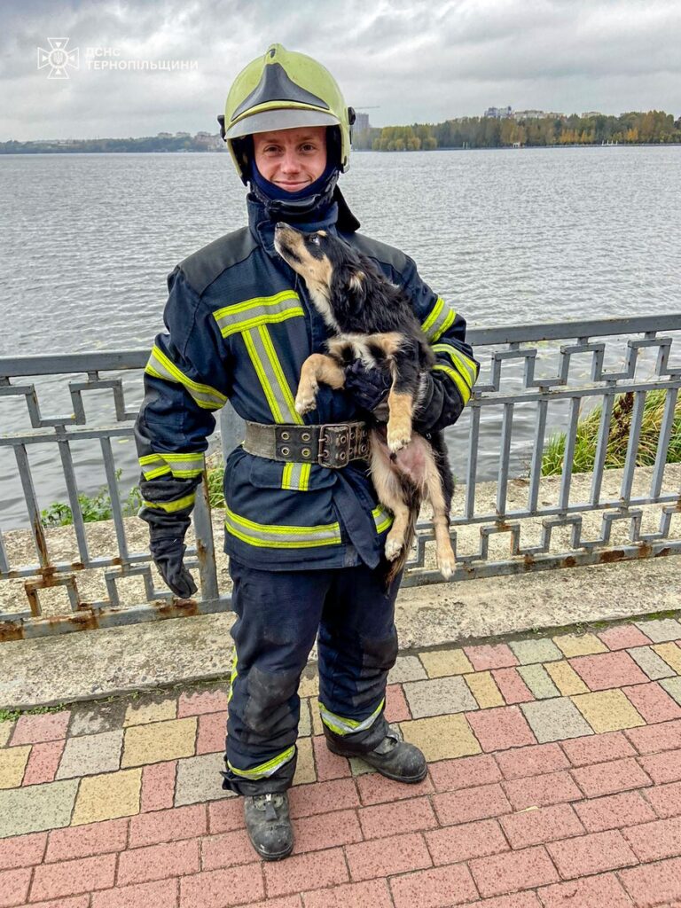 “На межі води й суші, посеред невеликого острівця очерету, стояв собака. Під лапами — волога земля, а довкола — пастка: з одного боку — стрімка бетонна стіна дамби, з іншого — холодна гладінь Тернопільського ставу. До рівної поверхні нагорі — якихось півтора метра, але для виснаженої та наляканої тварини ця відстань стала нездоланною.” – йдеться в дописі ДСНС Тернопільщини.