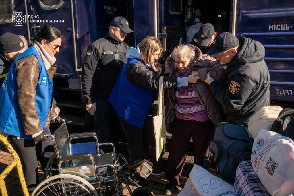 Потяг з евакуйованими людьми прибув до Тернополя 21 жовтня. На залізничному вокзалі літніх людей зустріли рятувальники, медики, волонтери та представники соціального захисту. Для тих, хто має проблеми з пересуванням, біля вагонів підготували спеціальні ноші та візки.