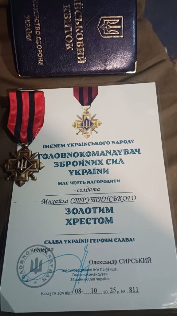 Михайло Струтинський відзначився під час виконання бойових завдань на фронті. Його професіоналізм та мужність не залишилися поза увагою командування Збройних Сил України. “Золотий хрест” – це визнання його героїчної служби та відданості Батьківщині.