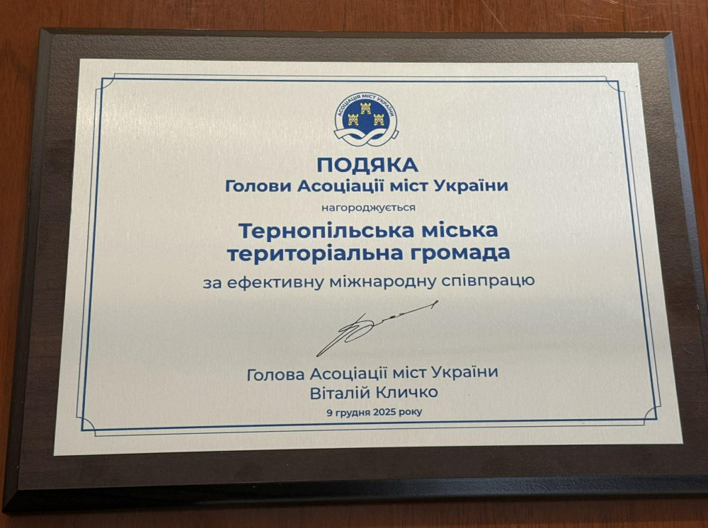 Тернопільська міська територіальна громада отримала подяку Голови Асоціації міст України за активну взаємодію з міжнародними партнерами. Це визнання роботи, яка допомагає місту розвиватися та залучати нові можливості для жителів.
