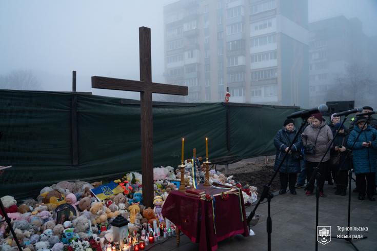 Хрест встановили поруч із будинком, куди влучила російська ракета. Після страшної події тернополяни постійно приносили до зруйнованого будинку квіти, дитячі іграшки та лампадки. На прохання громадян було вирішено встановити пам’ятний знак.