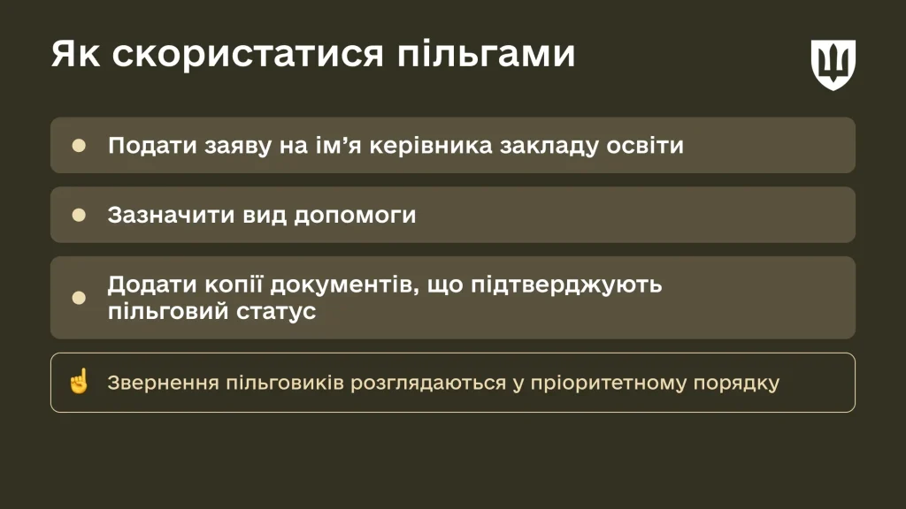• Першочергове зарахування до шкіл, дошкільних закладів та дитячих таборів за місцем проживання.