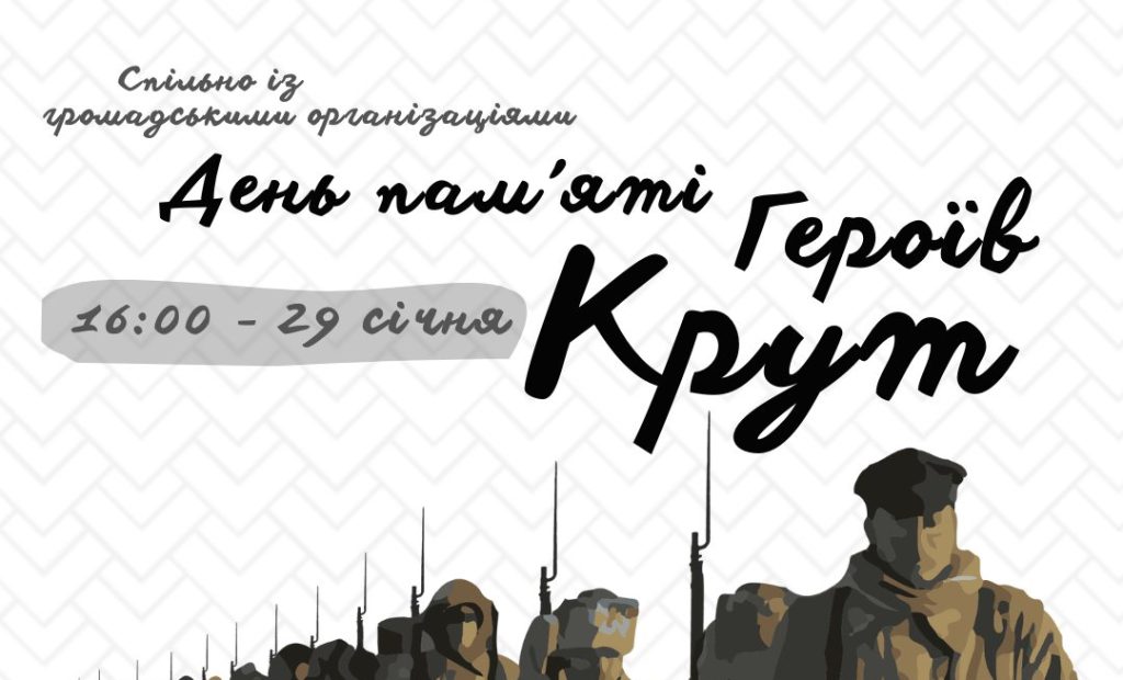 29 січня Тернопільська міська рада за координації Управління сім’ї, молодіжної політики та захисту дітей спільно з Тернопільською Молодіжною міською радою та молодіжними громадськими організаціями громади традиційно вшанують пам’ять Героїв Крут. Захід відбудеться у внутрішньому дворі Тернопільського історико-меморіального музею політичних в’язнів (вул. Коперника, 1) о 16:00.