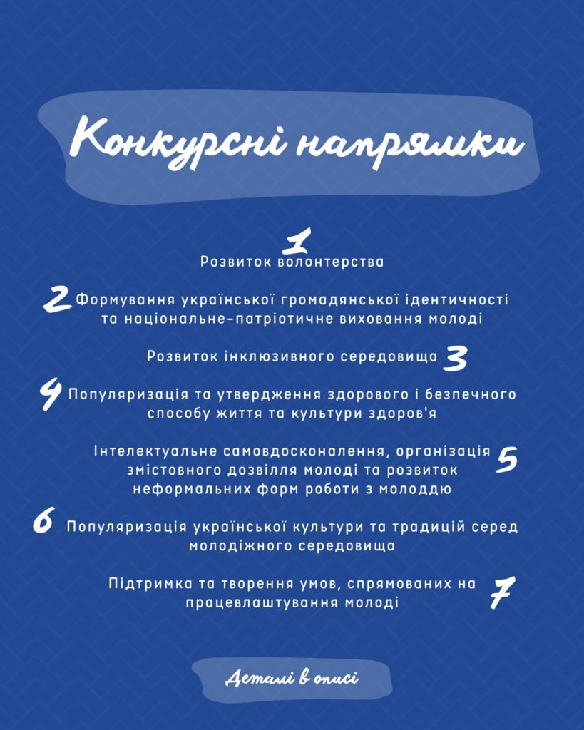 Серед пріоритетних напрямків – розвиток волонтерства, формування української громадянської ідентичності, створення інклюзивного середовища та популяризація здорового способу життя. Також підтримуватимуть проекти з інтелектуального розвитку молоді, популяризації української культури та сприяння працевлаштуванню.