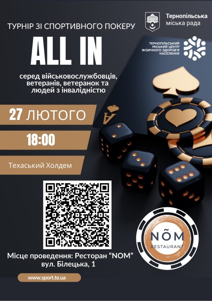 Турнір зі спортивного покеру “ALL IN” стартує 27 лютого о 18:00 у ресторані NOM (вул. Білецька, 1). Учасники змагатимуться за правилами Техаського Холдему, а новачки й професіонали гратимуть окремо.