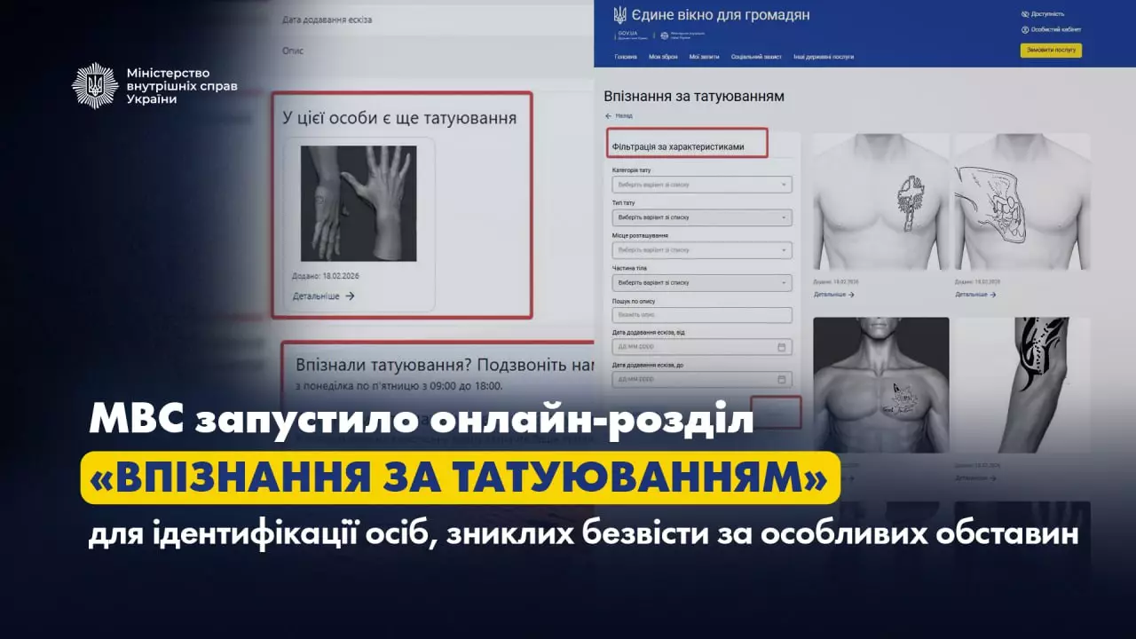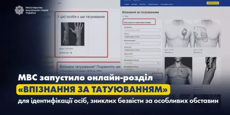 Міністерство внутрішніх справ запустило унікальний онлайн-розділ “Впізнання за татуюванням” для ідентифікації осіб, зниклих безвісти. Нова система допоможе родинам знайти своїх близьких через каталог ескізів татуювань.