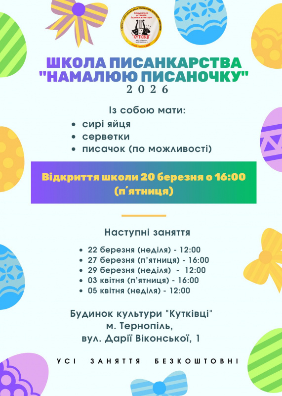 Для участі потрібно принести сире яйце, серветки та писачок, якщо є. Усі заняття абсолютно безкоштовні. Це чудова можливість провести час з родиною та долучитися до української традиції.