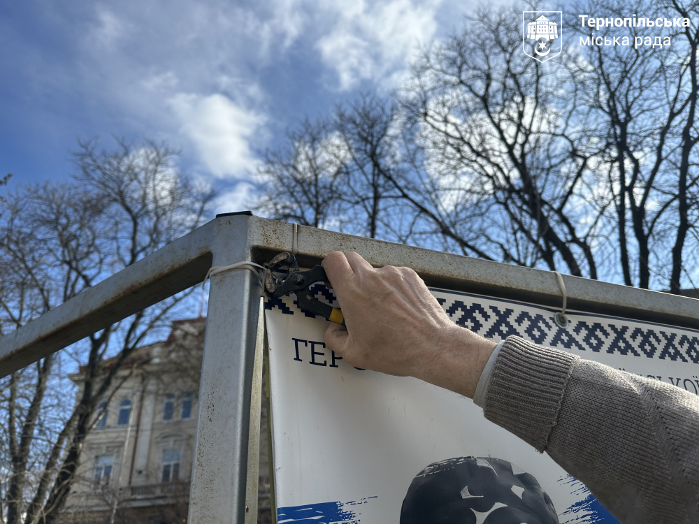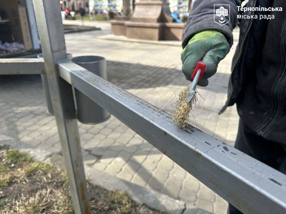 У центрі Тернополя комунальники оновлюють металеву конструкцію Алеї пам’яті “Незламні”. Через зимові негоди метал пошкодився та вкрився іржею, тому потрібен терміновий ремонт.
