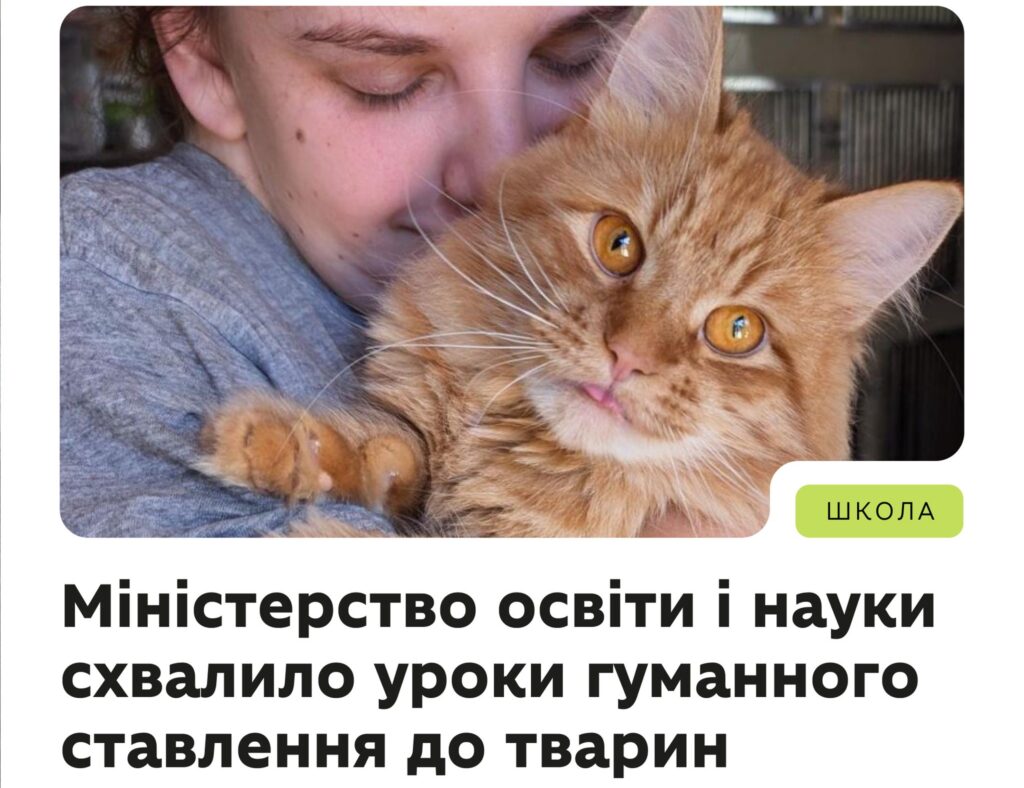 Українські школи отримали офіційно схвалену програму з 14 готових уроків про гуманне ставлення до тварин. Матеріали розроблені для початкової та середньої школи й отримали гриф Українського інституту розвитку освіти.