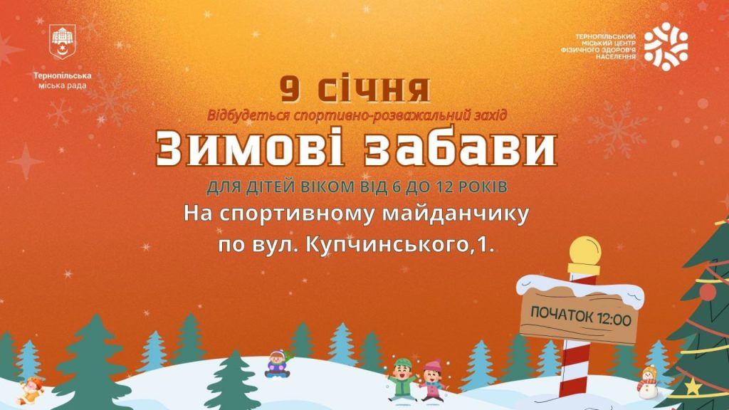 У Тернополі 9 січня розпочинаються “Зимові забави” для дітей віком 6-12 років на універсальному спортивному майданчику по вулиці Купчинського, 1. Захід стартує о 12:00 годині.
